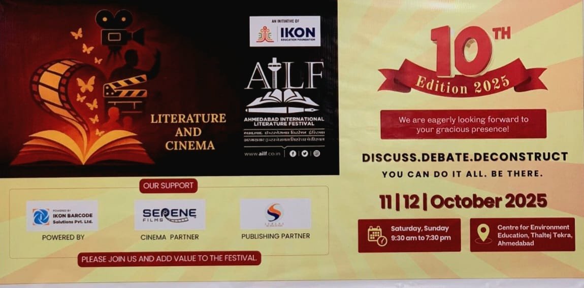 An initiative of Ikon Education Foundation, Ahmedabad International Literature Festival began its journey with a bang in 2016. Driven by the persistent efforts of its visionary and passionate Founder Director, Mr. Umashanker Yadav, guided by words of wisdom from an esteemed advisory panel, and powered by a dedicated team, AILF has steadily grown into one of the most respected literary events in the country. The 9th edition concluded successfully, and the 10th landmark edition is coming up on October 11–12, 2025, with the theme “Literature and Cinema.”